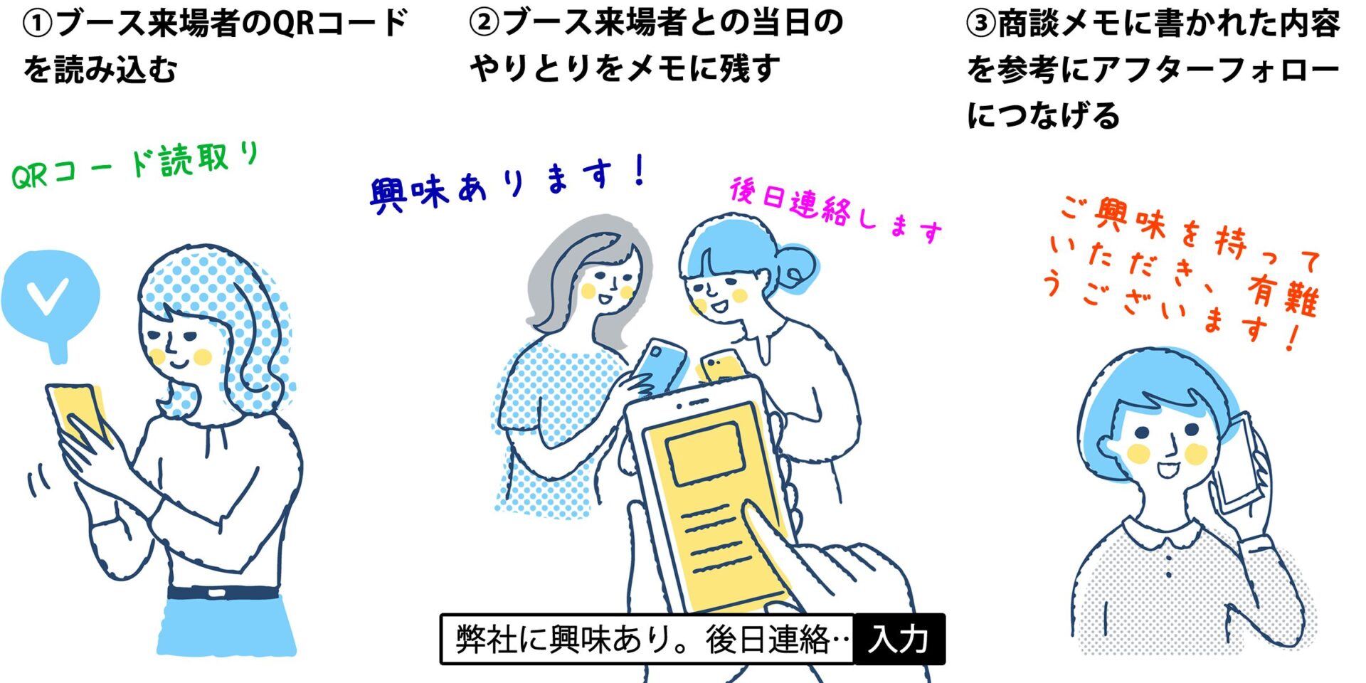ブース商談メモ機能とは、出展者がブース参加者のQRコードを読み取って情報を取得し、その人との当日のやりとりを担当がメモ入力して残せる機能です。商談メモ機能を活用することで当日のやりとりを残すことができ、商談メモに書かれた内容を参考にアフターフォローにつなげることができます。