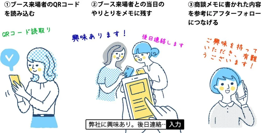 ブース来場者のQRをスキャンすることで、来場者情報(会社名・住所・業種など)を確認することができます。また、「商談メモ機能」を使って、商談時のメモを残すことができ、アフターフォローにつなげることができます