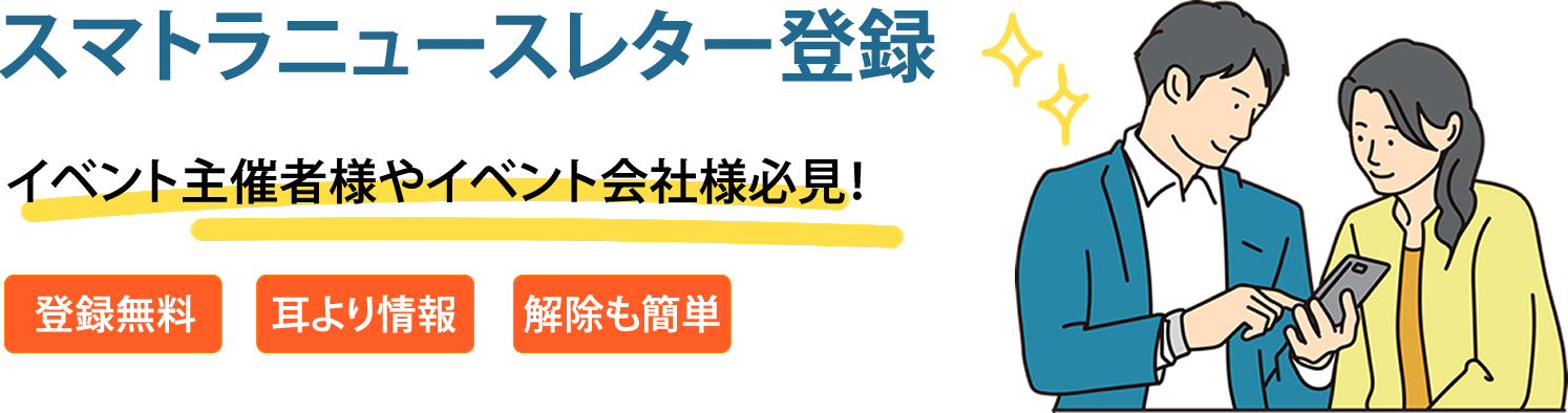 スマイルトラッキングの最新情報をはじめ、イベント・展示会主催に関する耳寄りな情報など、主催者・イベント会社様向けにニュースレターを定期的に発信しております。ニュースレター登録はもちろん無料。登録解除もとっても簡単です。ぜひご登録をお願いいたします。