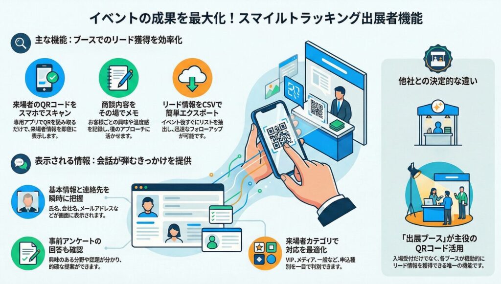 担当者: 多くのシステムは、入り口での入退場管理にQRコードを利用するだけですが、スマイルトラッキングは「出展ブース側が主体となって、リアルタイムで情報を表示・記録・ダウンロードできる」という点にこだわっています。出展者が自分たちの手でここまで完結できる仕組みは、おそらく他にはない唯一無二の機能だと言えるでしょう。