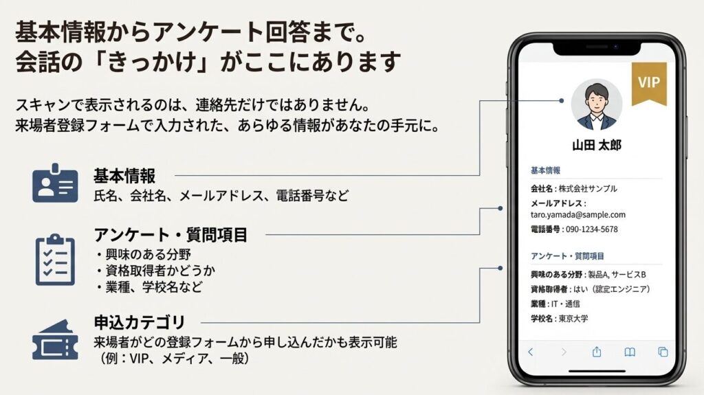 担当者: 単なる連絡先情報の取得に留まりません。スキャンすると、来場者が登録時に入力した名前、会社名、メールアドレス、電話番号等がその場で画面に表示されます。さらに、登録フォームで回答されたアンケート内容や質問項目の回答もリアルタイムで確認できるのが強みです。